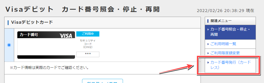 カード番号の変更は、「Visaデビット カード番号照会・停止・再開」から変更できます。