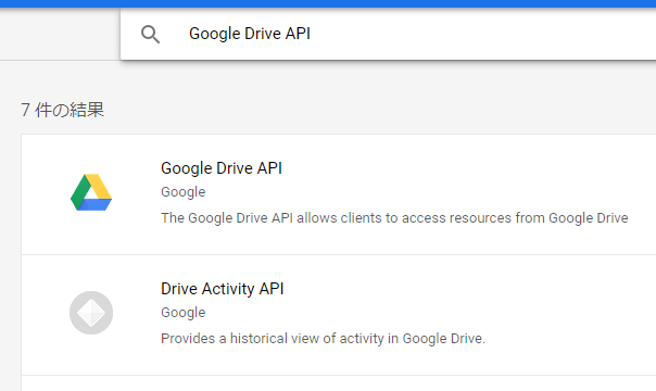 「Google Drive API」と入力すると、以下のように結果が表示されます。